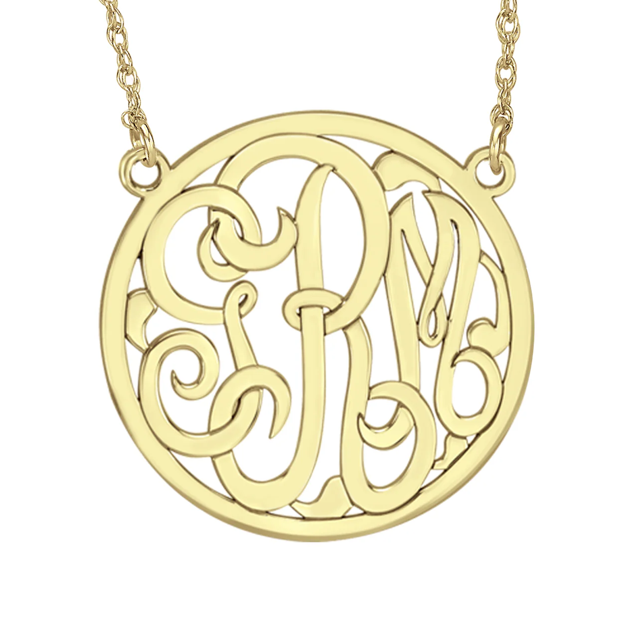 Our 40mm polished monogram necklaces are custom made with the initials you choose. Available in polished sterling silver, gold plating, 10k, or 14k gold. Please specify initials in the order you want them to appear.