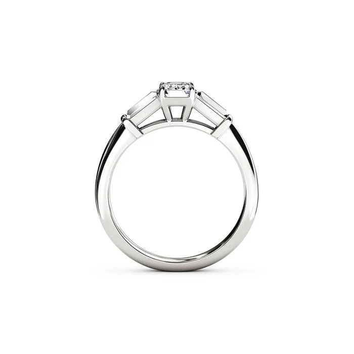 From the exclusive Studio Collection by Fink's Jewelers, this three stone engagement ring features an emerald cut diamond center stone with .15ct baguette side stones on each side. This vintage style engagement ring's emerald diamond center stone is available in a variety of carat weights ranging from .50ct to 2.00ct. This diamond ring is H-I in color and VS2-SI1 in clarity. Every engagement ring is backed by the Fink's Jewelers Lifetime Guarantee.
